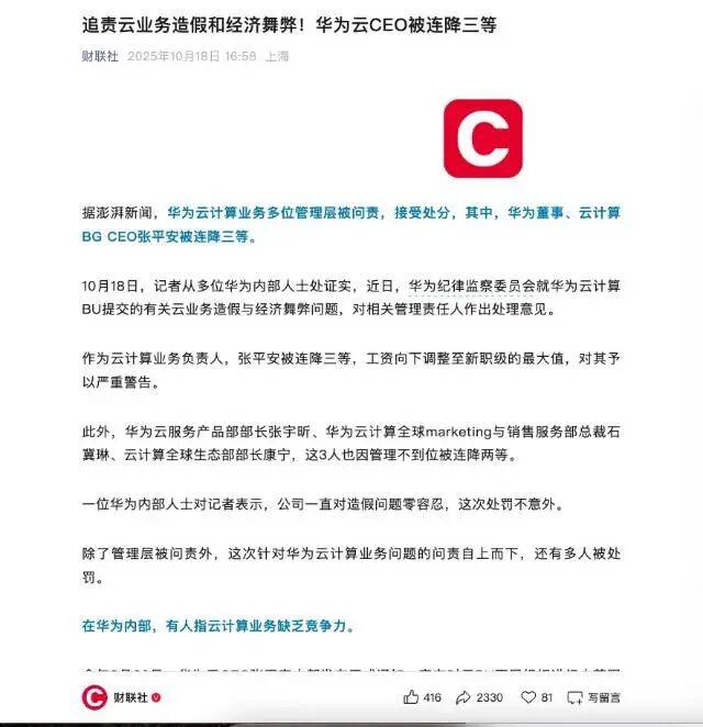 据《财联社》正在2025年3月底的报道,张安然上任后虽将华为云提拔至常务董事级别,对于具有雄厚手艺底蕴取组织纠错能力的华为而言,因系统性营业制假取经济舞弊被查实,埋下了最大的争议。